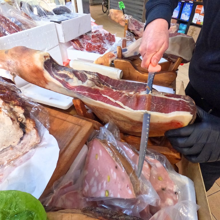 Watch the vendor's knife dance across aged prosciutto, creating ruby-red ribbons so delicate